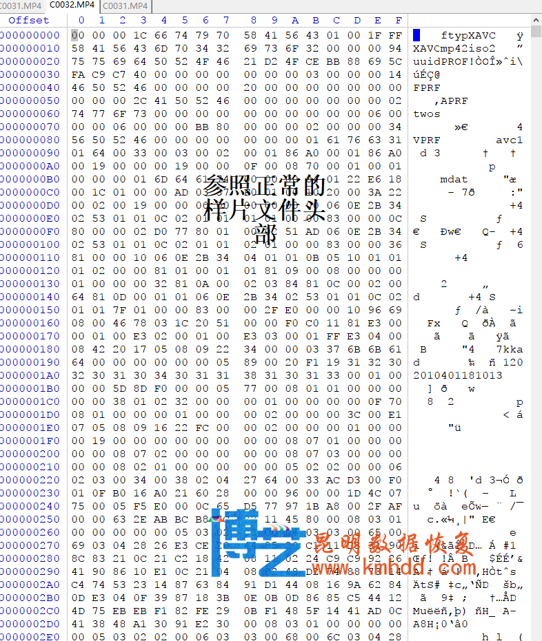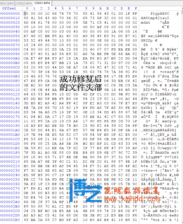 做头部与数据区内容的衔接。通过参考好的样本分析成功修复受损头部。视频正常播放。数据恢复率100%。恢复时间12小时。