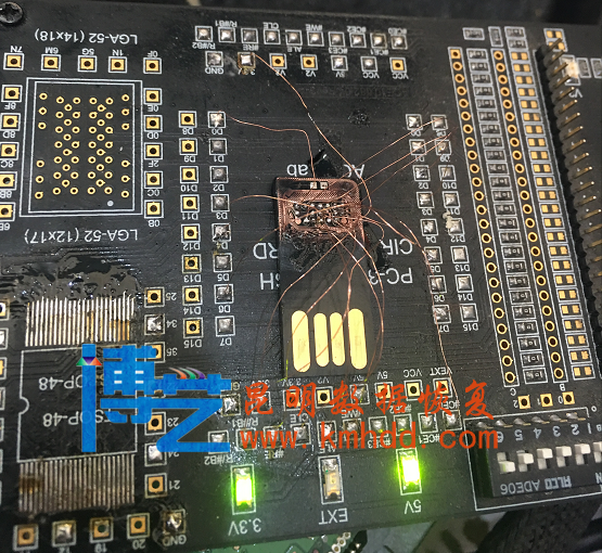 恢复过程:此款U盘故障送修为插电脑上不识别,未泡水或摔坏。王师拆开后是一个防水U盘无存储芯片。这种U盘如果要恢复数据难度非常大,因为要事先打磨掉U盘的绝缘漆,再开发数据地址线等定义,技术难度非常高。做完上述准备工作后用我们工具的专用飞线板在显微镜下一根一根的焊接好。接到设备上成功读出U盘DUMP文件。经过5小时的努力。数据恢复成功。恢复耗时6小时。