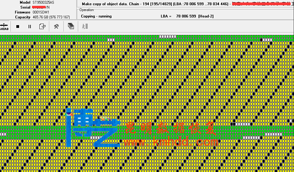 硬盘客人讲在使用过程中一不小心拔的时候摔到地上了,当时还正在使用.再插上的时候便能听到"吱,吱,吱"的响声,后客人与我们技术员小钟联系,让客人不要再通电,以便将盘片划伤.盘接到手后,没有敢再通电,直接在无尘工作台上拆开,肉眼便能看出有两个磁头物理变形,而且都已经翘起来了.这种故障直接更换磁头后,盘顺利就绪.直接做DE映像.COPY中时有一面盘面出现,弱磁道和很多坏道,通过智能读取和人工设置.数据全部恢复.数据恢复率100%.耗时6小时.(www.kmhdd.com)